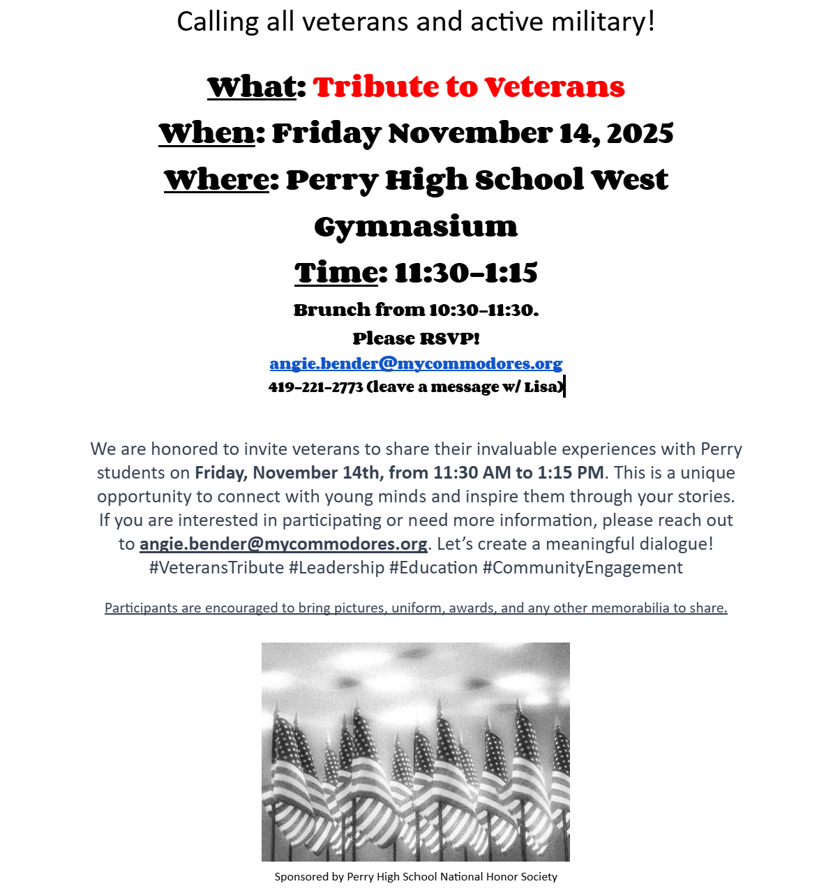 A Tribute to Veterans Perry High School's National Honor Society will be hosting a Tribute to Veterans event on Friday, Novemeber 14, 2025. Get the details here: