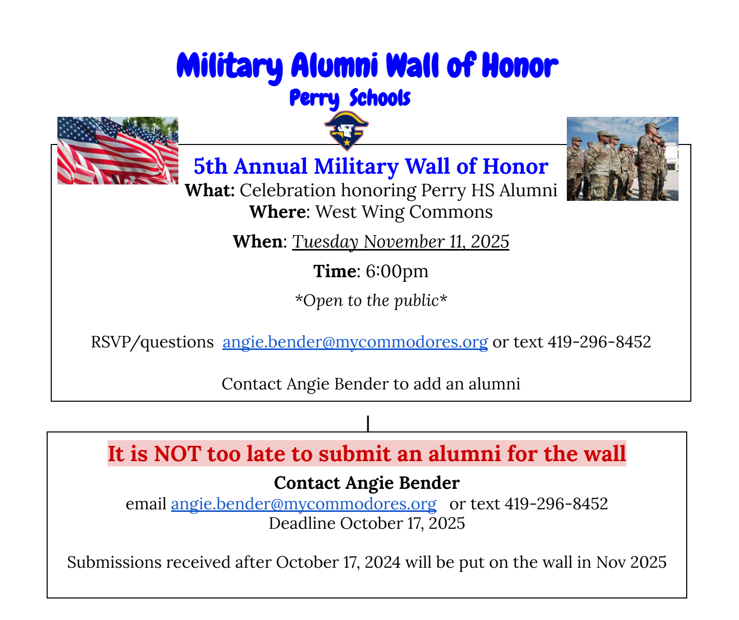 The Perry Schools Wall of Honor Enters its 5th Year The 5th annual Military Wall of Honor Celebration will take place on Tuesday, November 11, 2025.